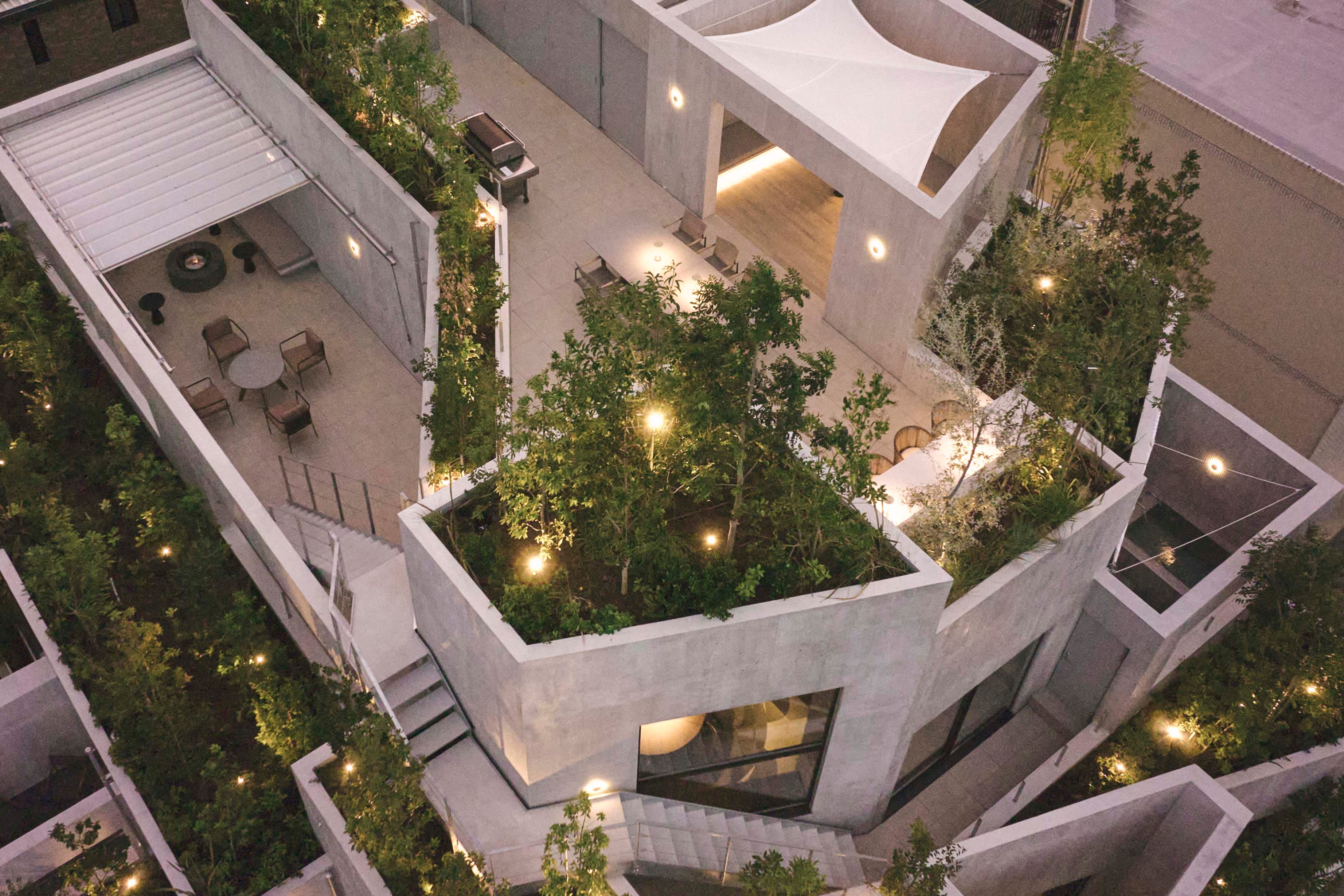 贅沢なルーフトップテラス、最大5名まで入れるサウナや水風呂など、幾つもの空間が自由に連なる回遊の家。テラスを合わせ250㎡以上の空間が5階と屋上に渡り広がります。