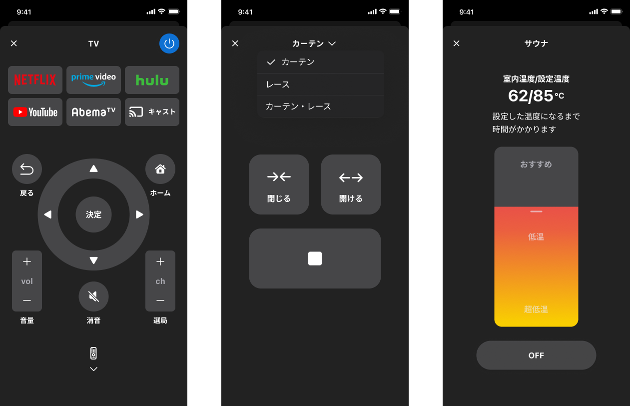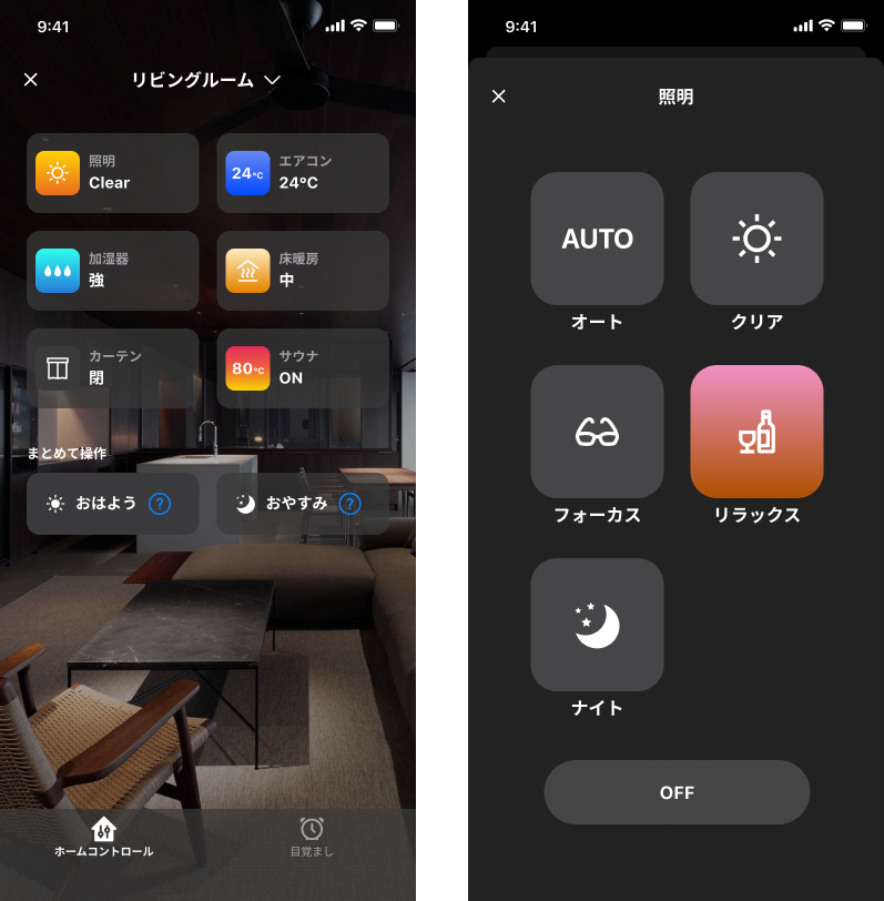 これによって、水風呂、お風呂、温泉を除く全ての機器が、いつでもどこでも調整可能に。例えば、外出先から帰る途中にエアコンをつけて快適な温度にすることも、照明を調整してくつろぎの雰囲気を作り出すこともできます。