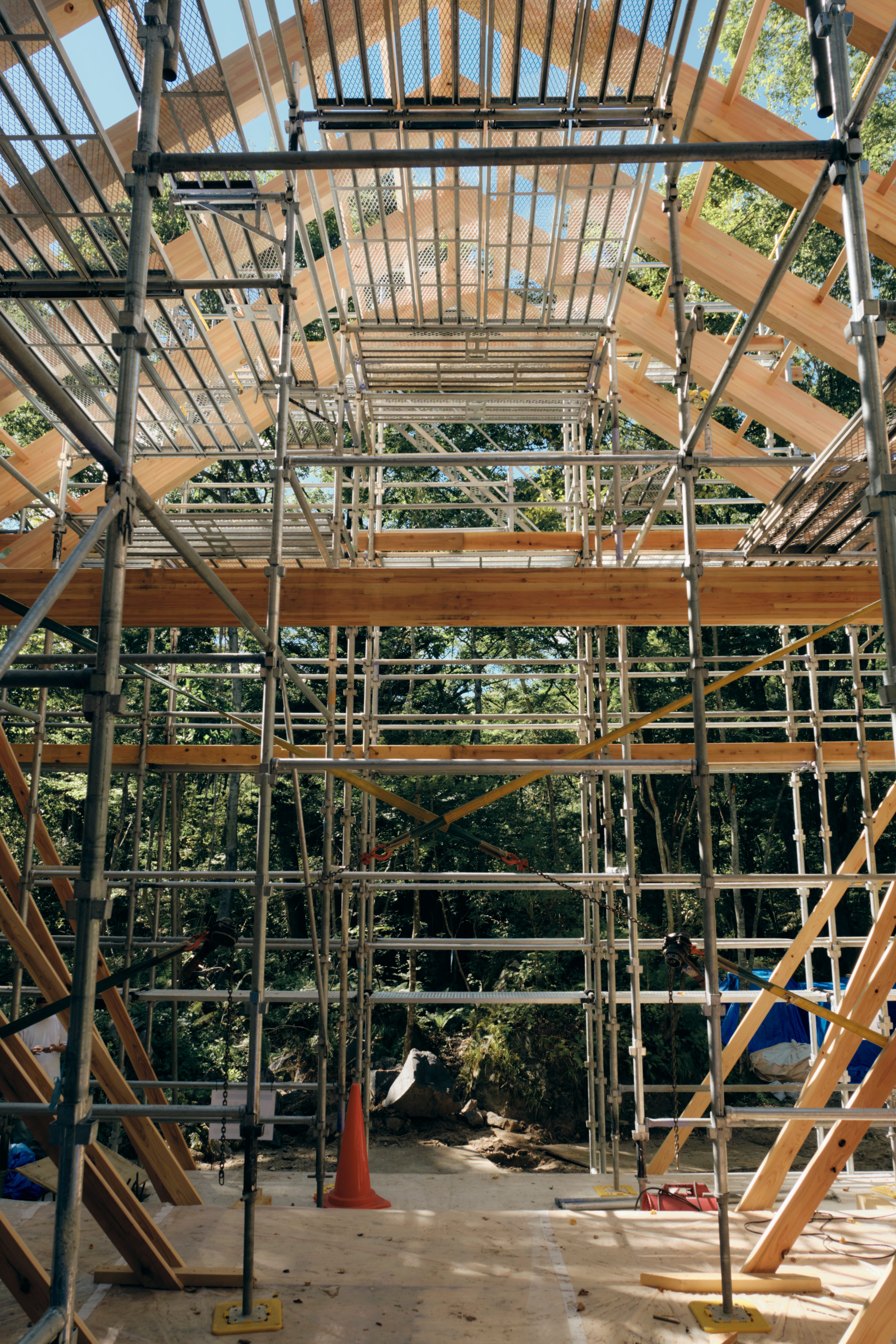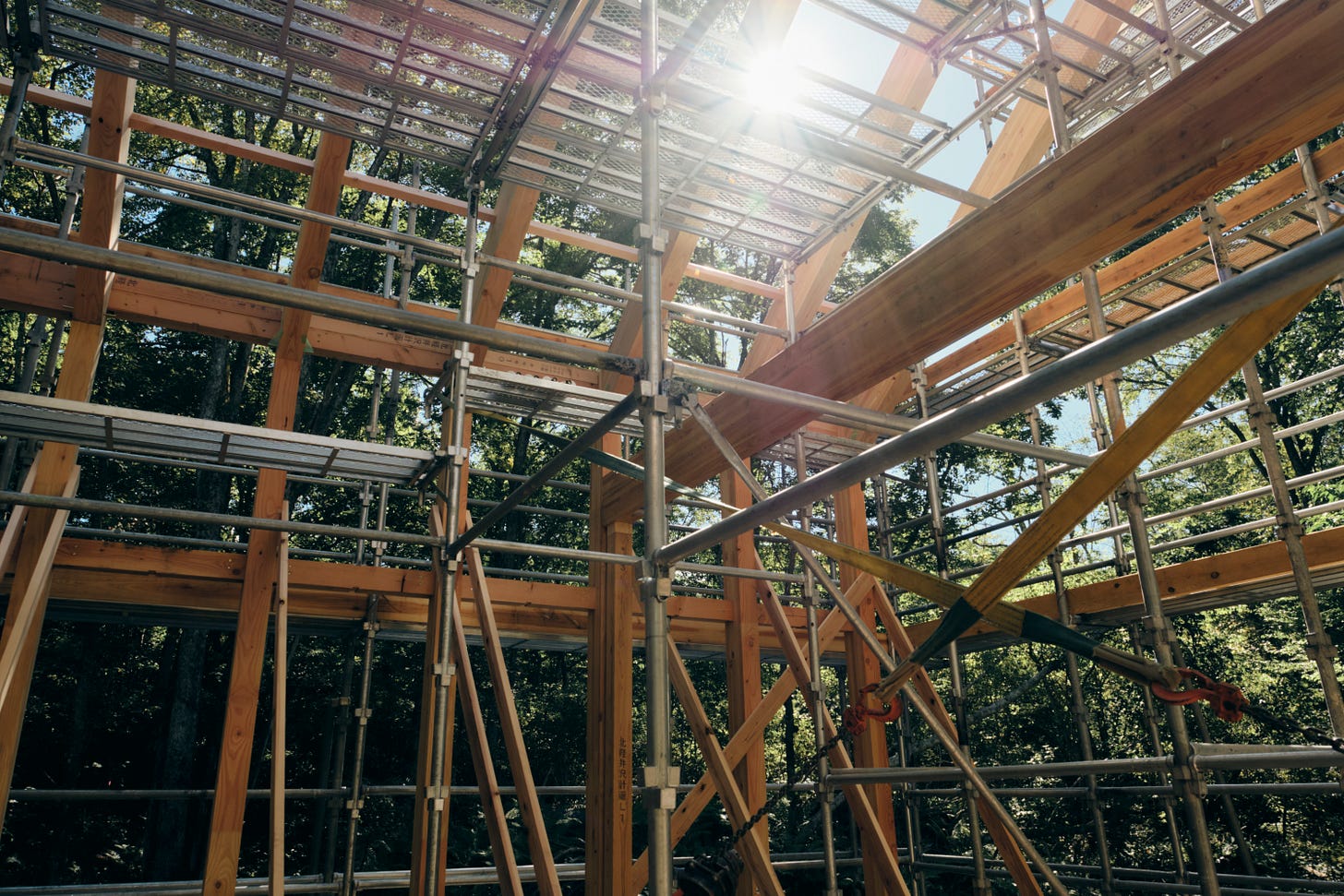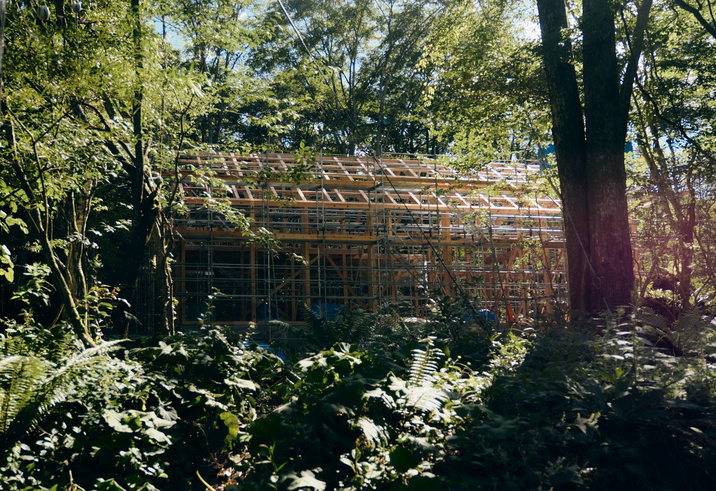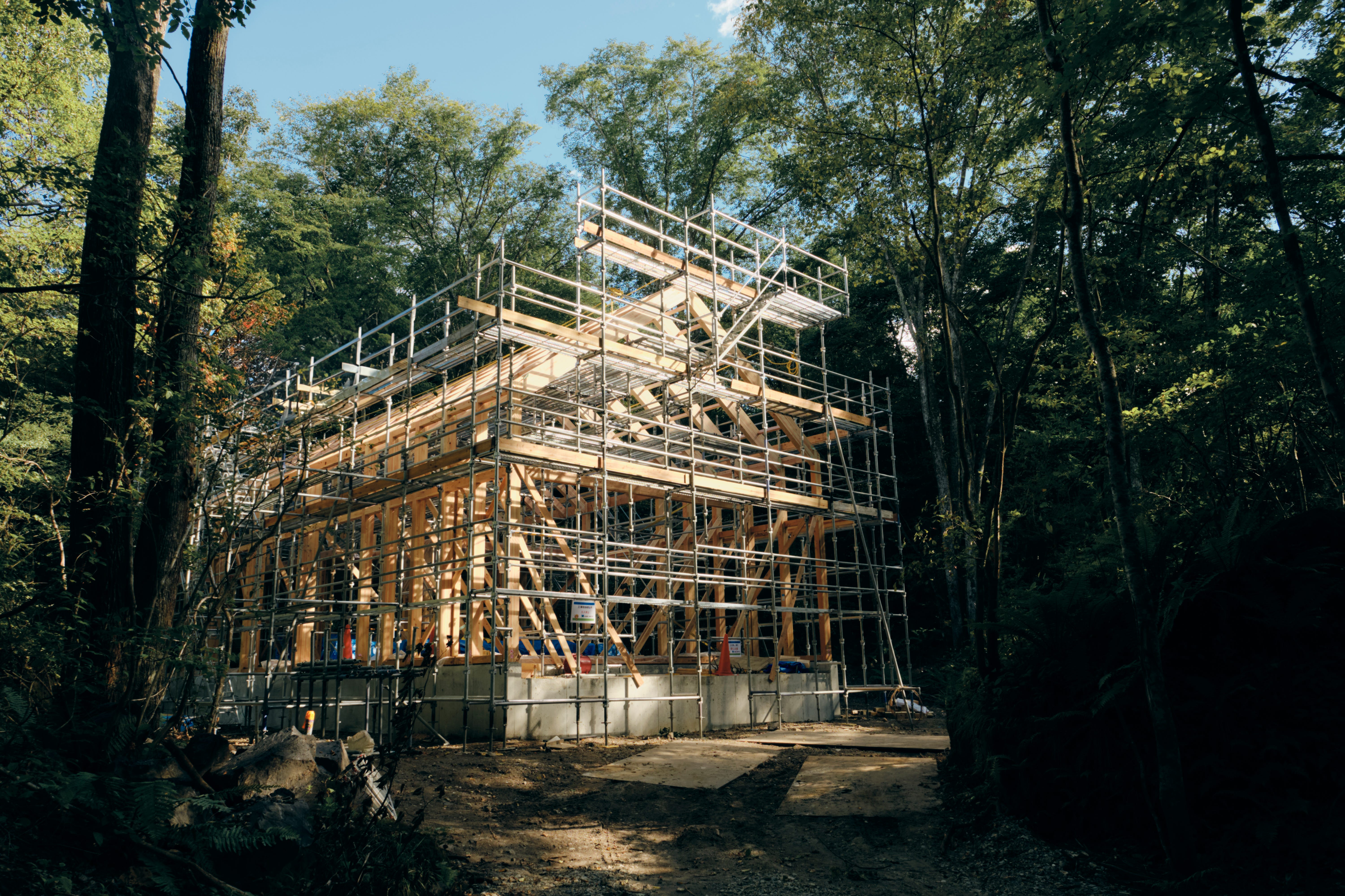 3サイズのうち、最も大きいMODEL Lの建て方(家の骨格になる柱や梁などの主要構造部を木で組み立てる工事)の様子。日光が綺麗に差し込む場所に建設中で、森の中で一際目を惹きます。