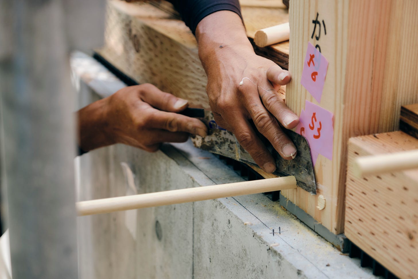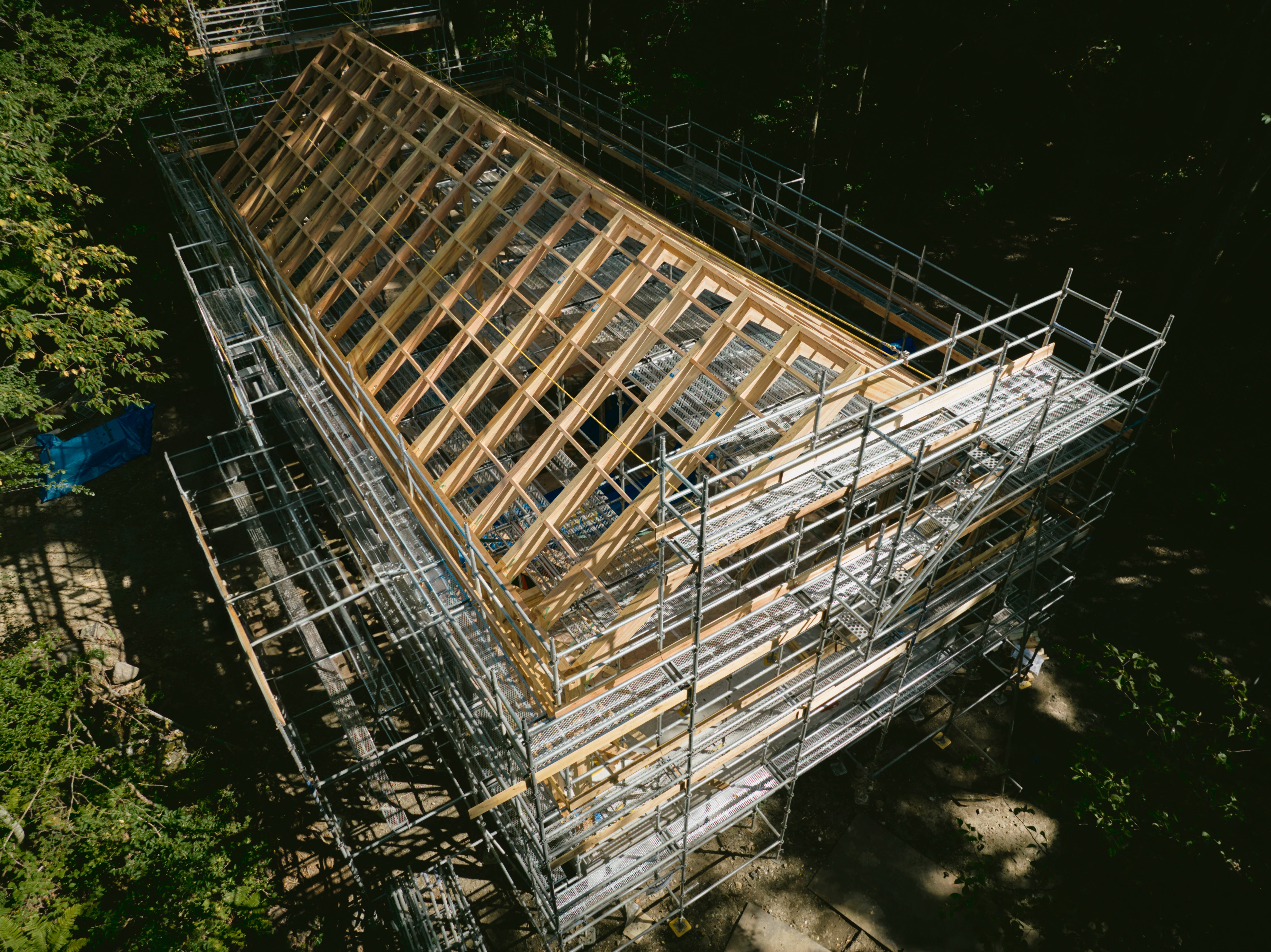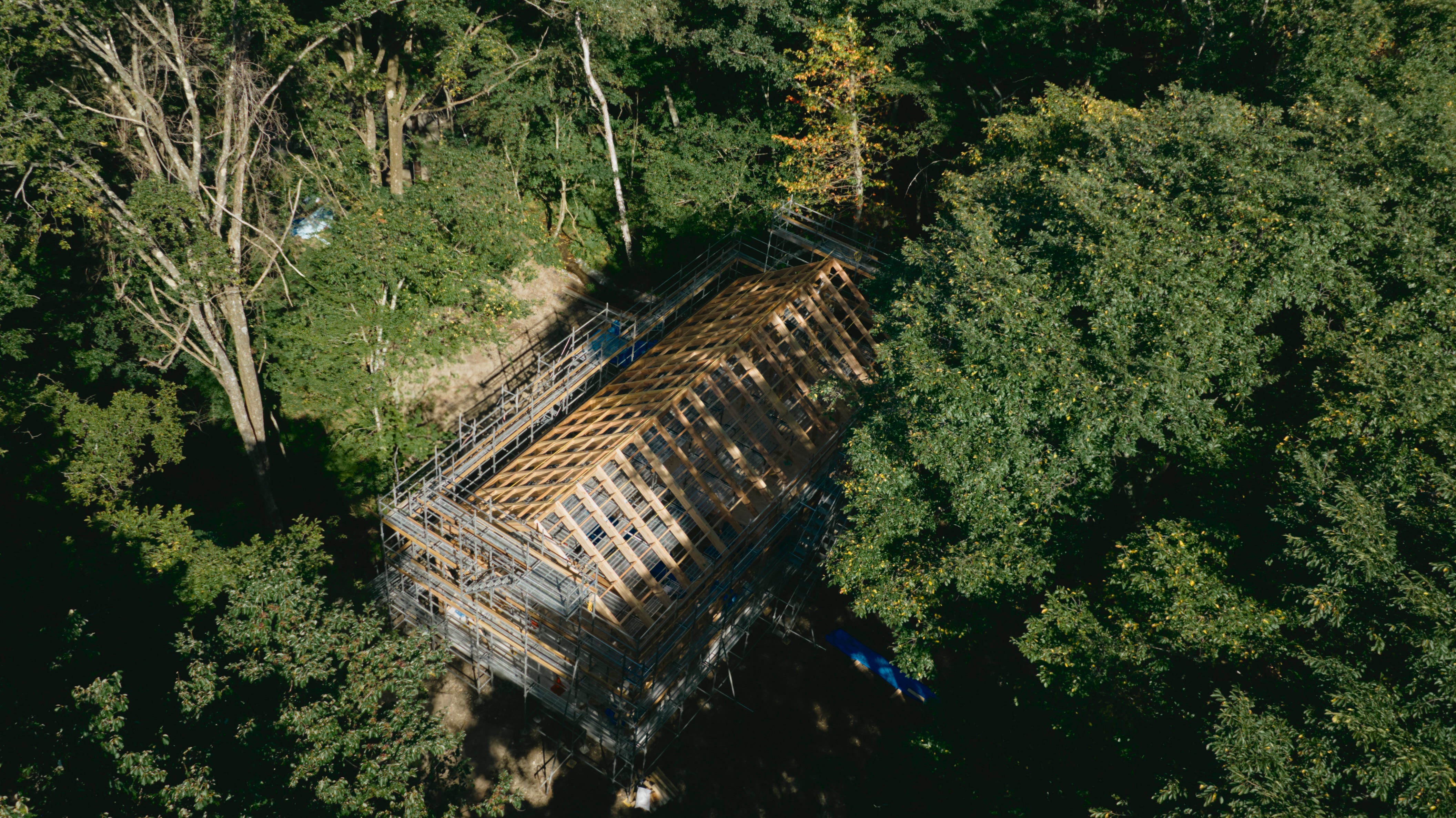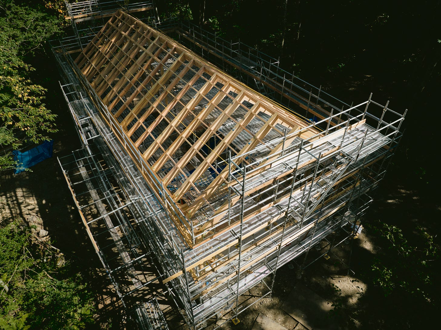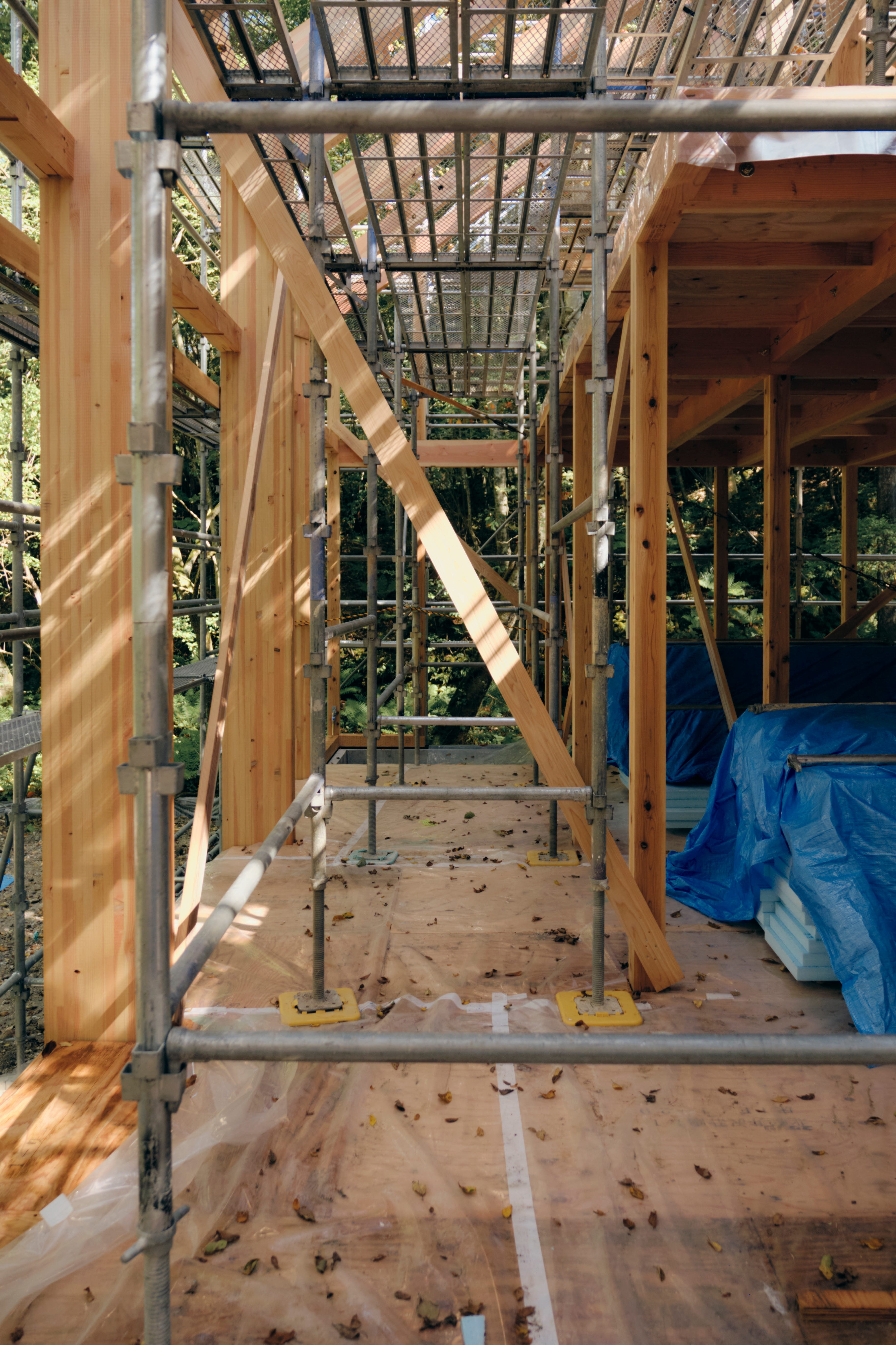 3サイズのうち、最も大きいMODEL Lの建て方(家の骨格になる柱や梁などの主要構造部を木で組み立てる工事)の様子。日光が綺麗に差し込む場所に建設中で、森の中で一際目を惹きます。