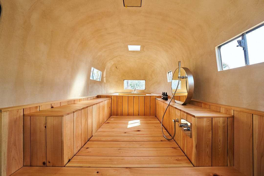 トレーラーの中に足を踏み入れると、豊かで品のある香りに包まれる檜風呂が。職人が手塗りしたモルテックスの内壁に差し込む光が、まるで洞窟の中を思わせる。青島では波の音を聞きながら湯に浸かってリラックスすることができます。