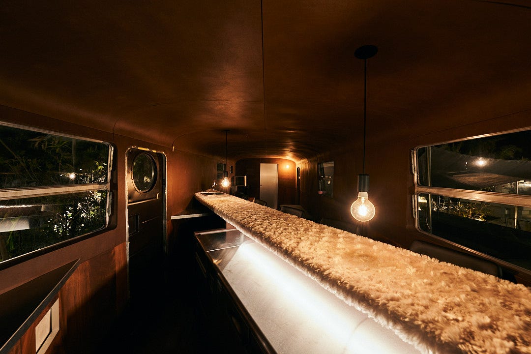 大きめな車体「スパルタン」の中にあるのは、バーカウンターやカラオケを備えた本格的なスナック。電球の光に照らされた薄暗い空間で、ゆっくりとお酒を味わったり、友人と語らったり。少し酔いが回ってきたら外に出て、潮風に当たれるという至福の環境です。
