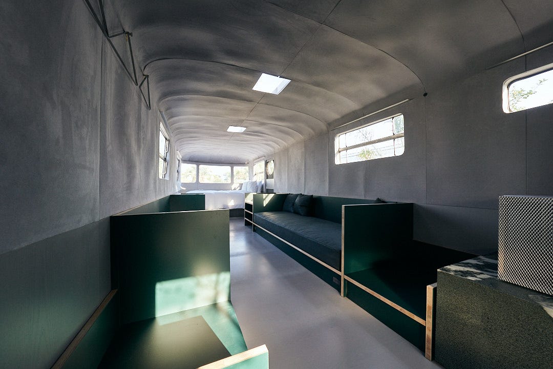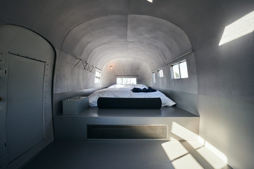 ベッドとソファ、洗面を備えた、リラックスのためのトレーラー。都会を離れても、快適な睡眠を実現。内壁を覆うウルトラスエードのグレーと、ソファのグリーンというミニマルな配色がまるで宇宙船のような印象に。
