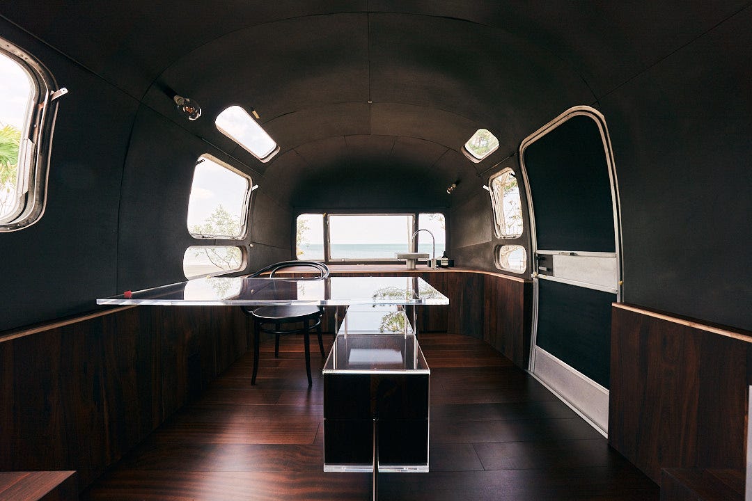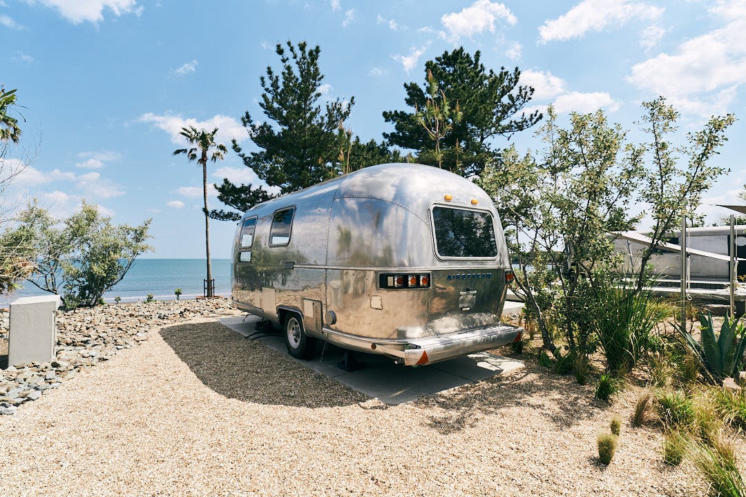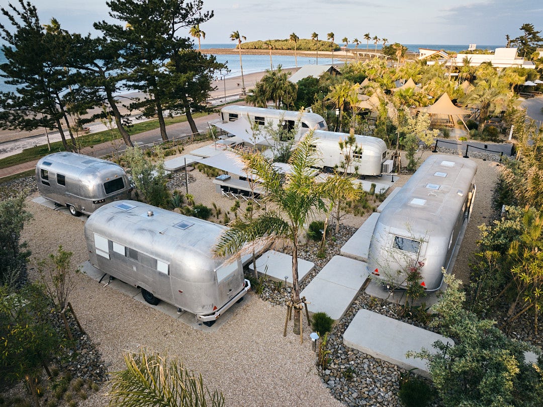 現在、宮崎県青島に設置されているANYWHERE。エアストリームとスパルタン、2種類のヴィンテージトレーラーが並びます。オーシャンビューを考慮して配置された5台の中心にはBBQスペース。旅先におけるリビングは自然を存分に味わえる屋外に、という考え方のもと、仲間との憩いの場としてお使いいただけます。