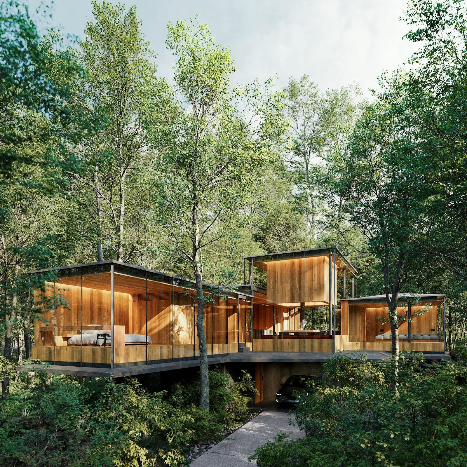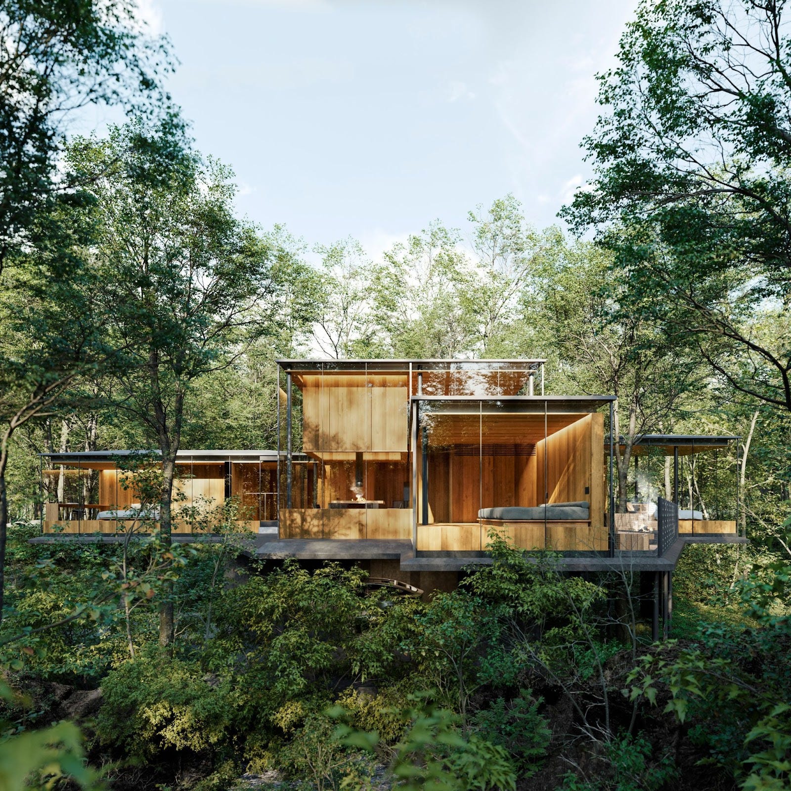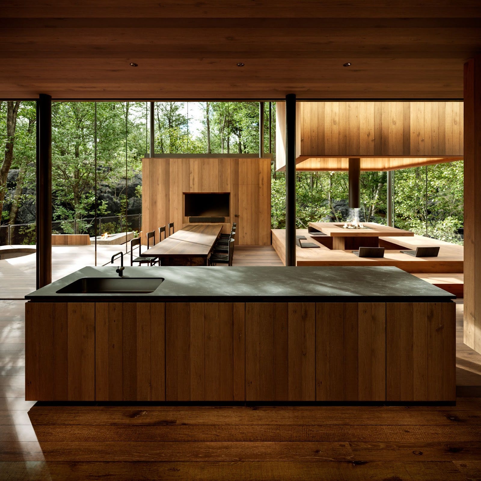 都心から95分。北軽井沢に広がる2万坪の森に誕生する、囲炉裏を備えたガラスと木の建築