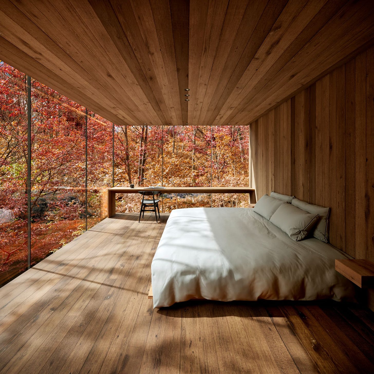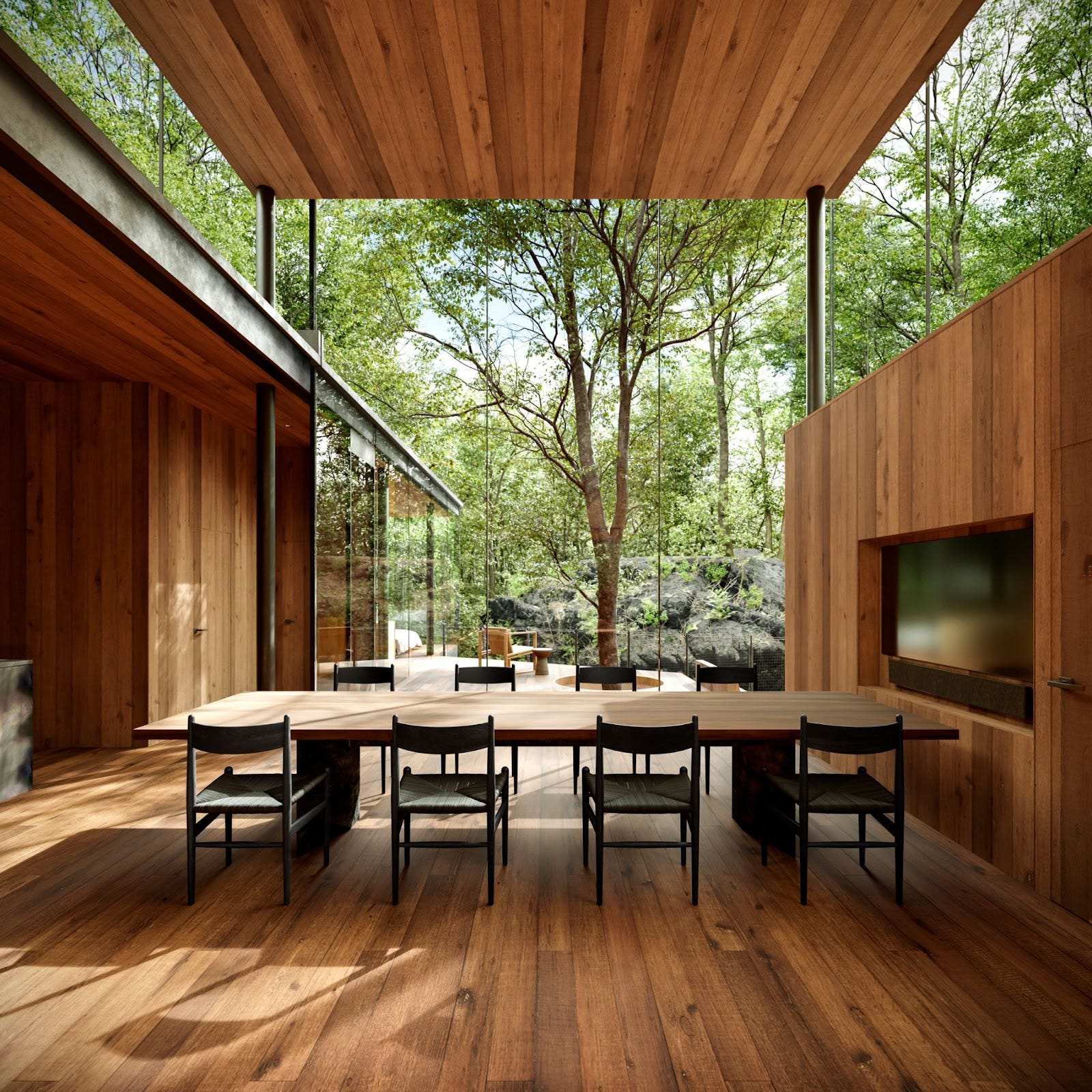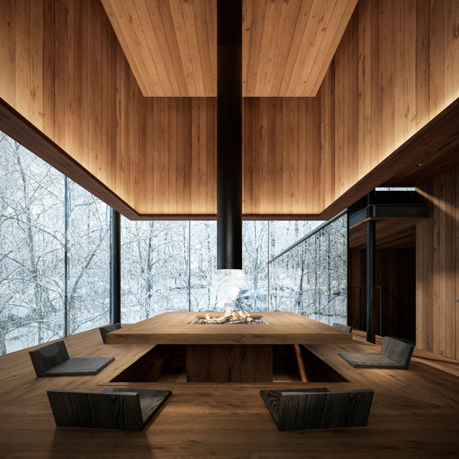 都心から95分。北軽井沢に広がる2万坪の森に誕生する、囲炉裏を備えたガラスと木の建築
