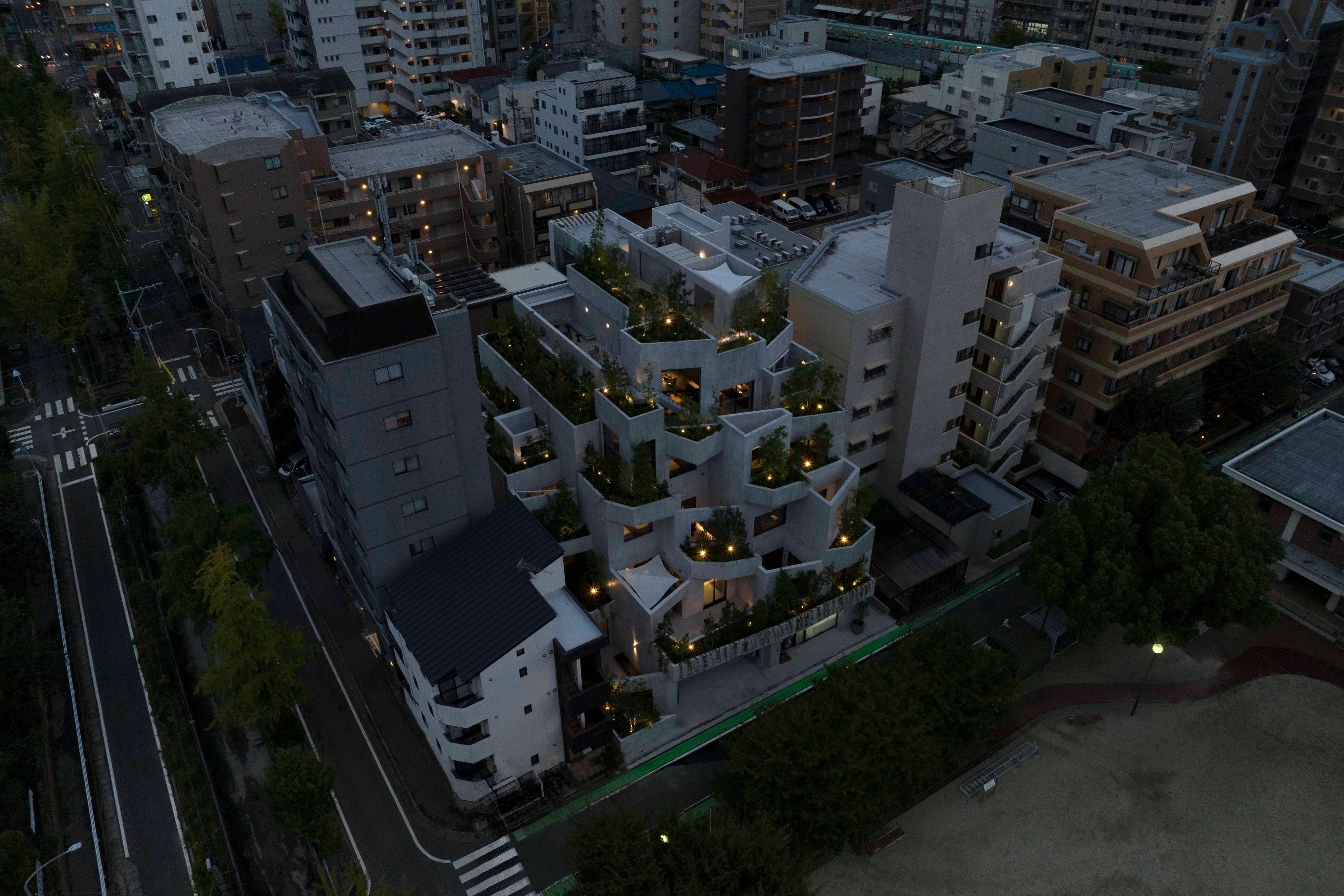 この11月に開業した「NOT A HOTEL FUKUOKA」は、ランダムに積み重ねた箱から緑があふれるような不思議な形状。ワークスペースに特化した部屋や、シェフを呼んで食事を楽しめる部屋、テラスにジェットバスを配したリトリートのための部屋など、異なるコンセプトをもつ8部屋が積み重なっている。一見奇抜に見える建物は、いかに街に溶け込めるかを追求した結果として、必然的に導き出された形だった。