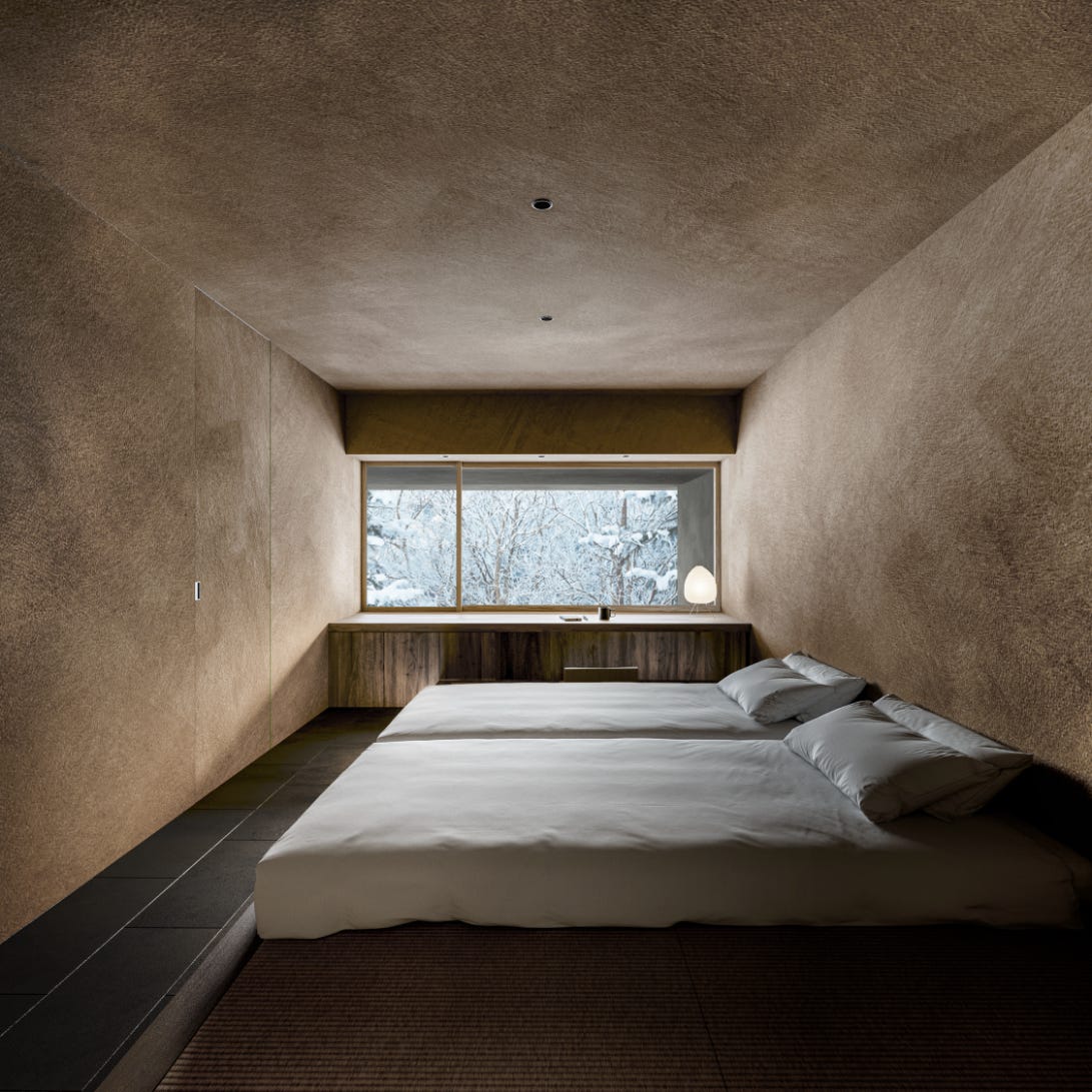 総面積約250㎡のヴィラは、それぞれ最大6名での滞在が可能。2ベッドルームやシャワールーム、専用駐車場を備えた1階部分と、露天風呂やリビングを備えた2階部分から構成。リビングを囲むようにインフィニティプールと温泉が位置しています。訪れた時からプライベートな空間に身を置くことのできる建築です。