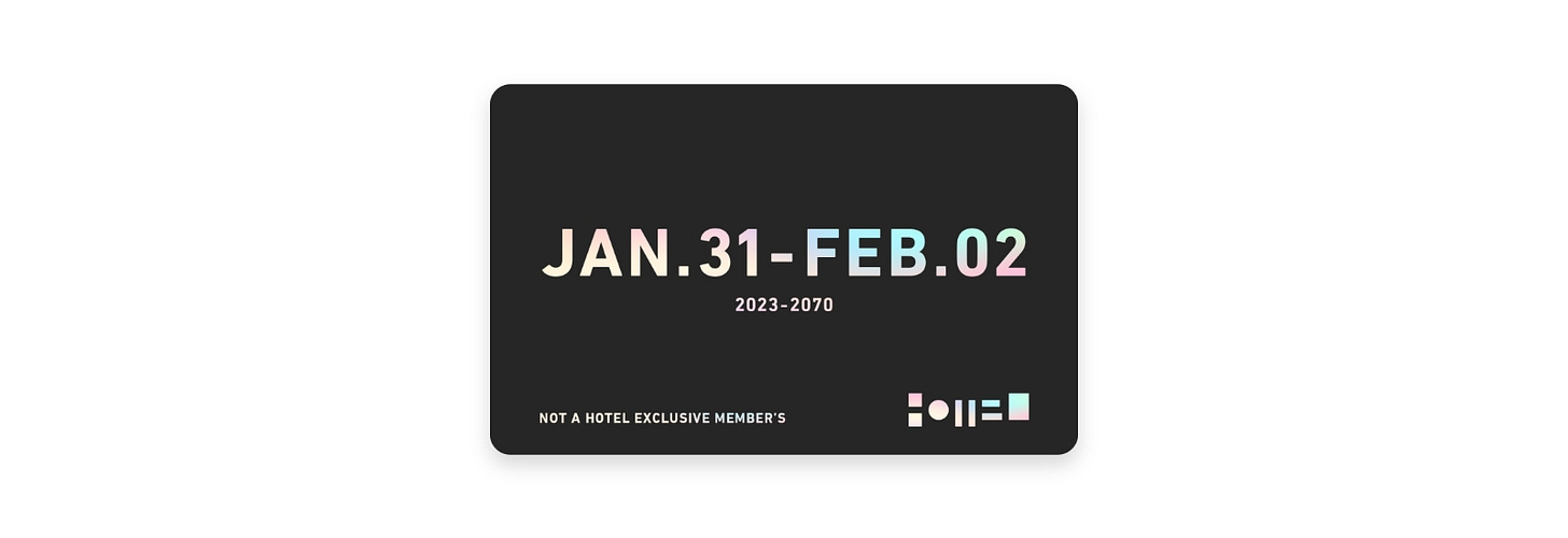 NOT A HOTELのNFTを購入すると、メンバーズカードに日付が刻印されます。このランダムに割当された日に、毎年NOT A HOTEL を利用する事が可能になります。