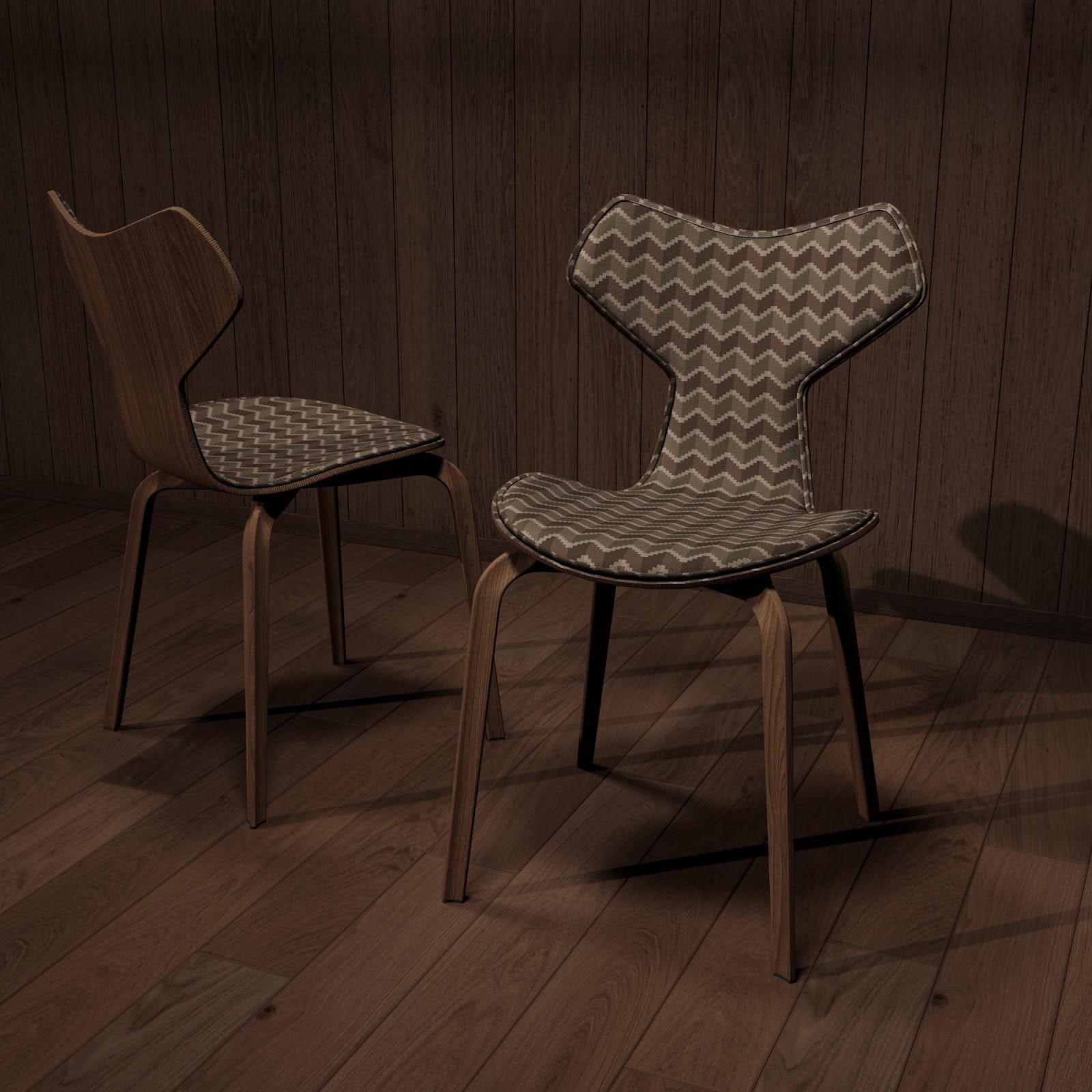 室内にあるフリッツハンセンのグランプリチェアは相澤陽介氏のテキスタイルデザインによるNOT A HOTEL PRODUCTSオリジナルモデル。三角屋根と調和したテキスタイルは、インテリアをこの場所だけの特別な空間へと彩ります。