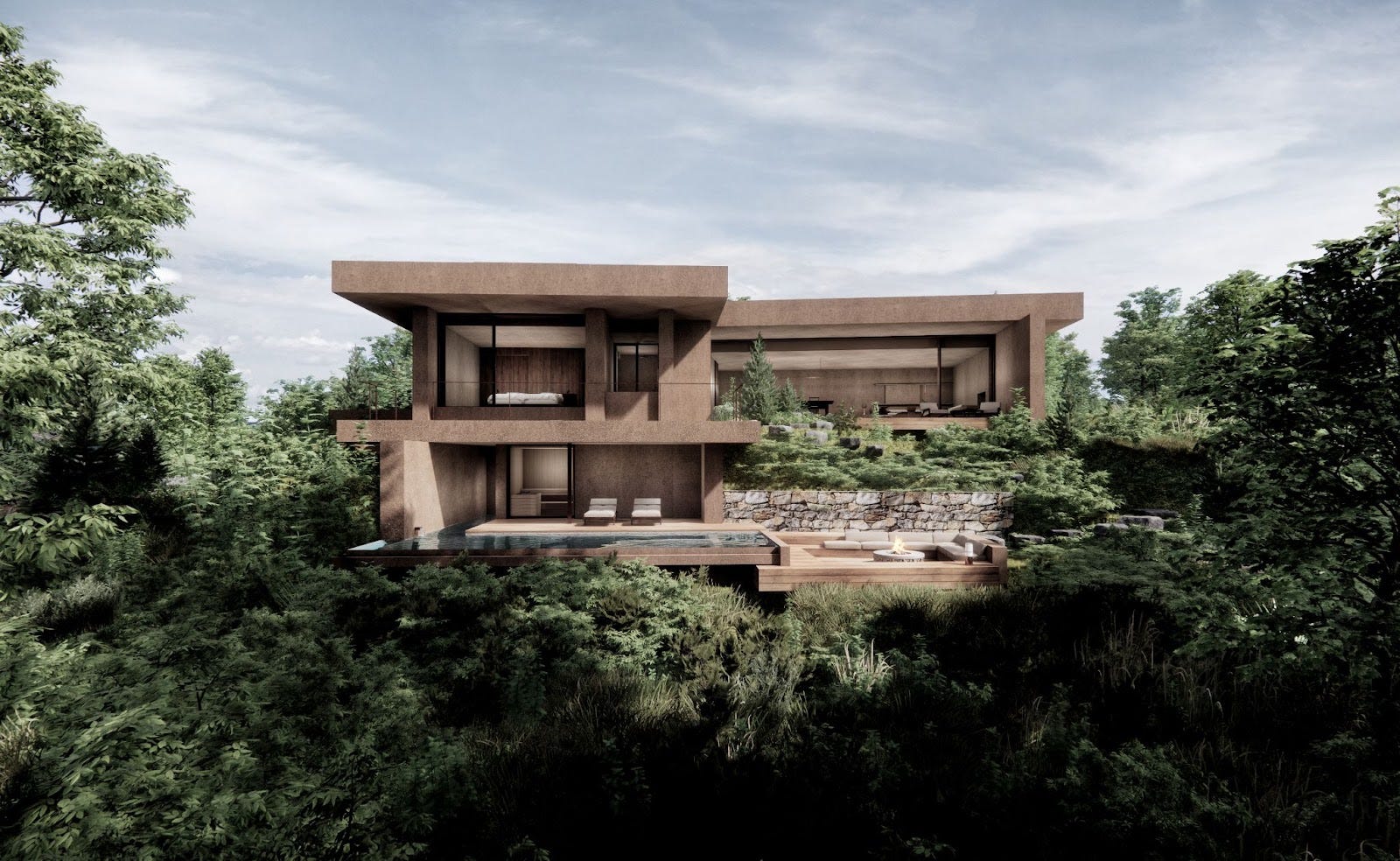 土地の傾斜に沿って建設された、幾つものレイヤーが重なる家。土色の外装で周りの景色と溶け合います。480平米もの広大な空間には、3つのテラスやプールにサウナ、ファイアプレイス、屋上につながるゲストルームなど、多様なシーンが点在。それらをリズミカルに繋ぐ有機的な飛び石の階段も魅力です。