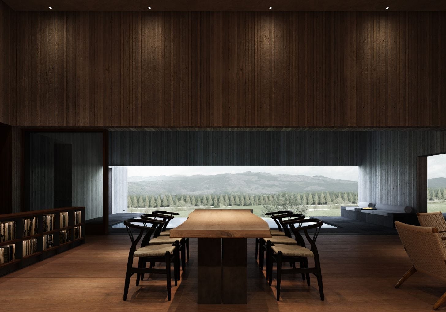 本棚を抜け階段を上がると、テラスとプールを介し、暗がりの室内からまるで額縁のように切り取られた牧場の景色が広がります。約60平米の広々としたリビングダイニングには暖炉を設置。お気に入りの場所を見つけて、ゆっくりとくつろいでみてください。