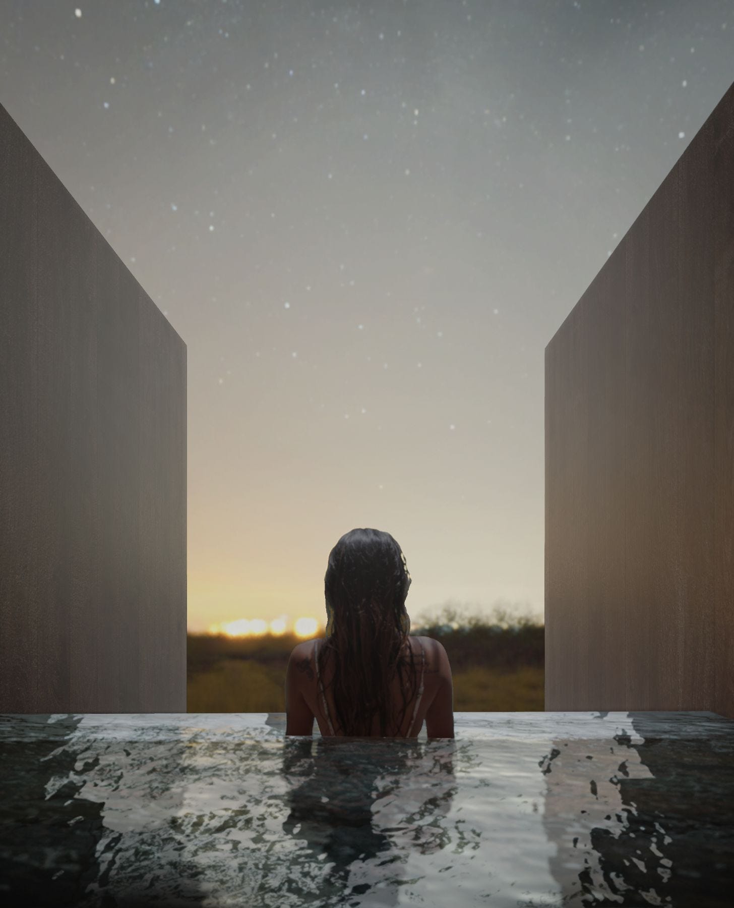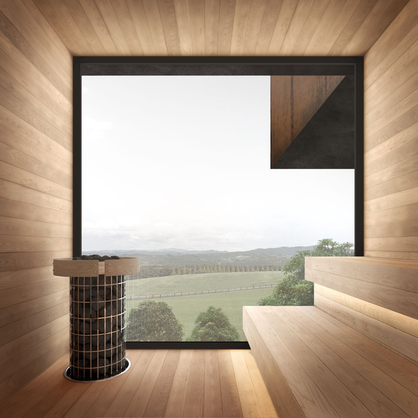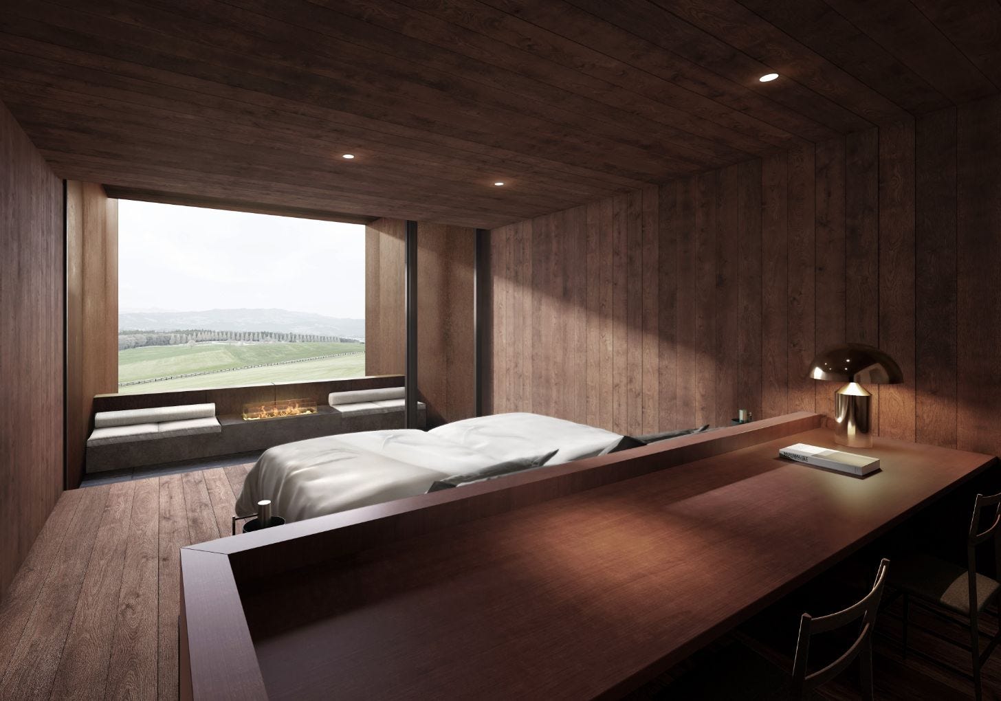 部屋のシンボルである牧場に向かって縦に伸びるプールは、浮かんでいるだけで特別な時間にしてくれそうです。そしてなんとこのエリアには天然温泉が湧いています。露天風呂は源泉掛け流しの温泉。さらに眺望抜群のサウナ、水風呂も備えています。ファイアープレイスのソファで焚き火をしながらととのう時間も最高です。
