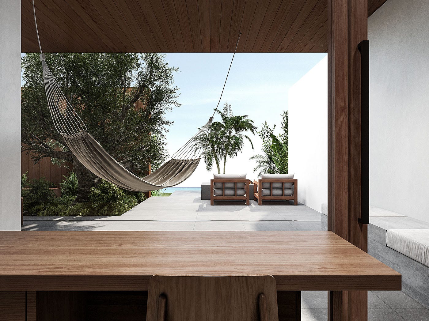 「あくまでテラスがメイン。それに対して寄り添うコテージを構成するようにデザインしたんです」と大堀が語る青島の家の魅力はやはり広がるテラス。