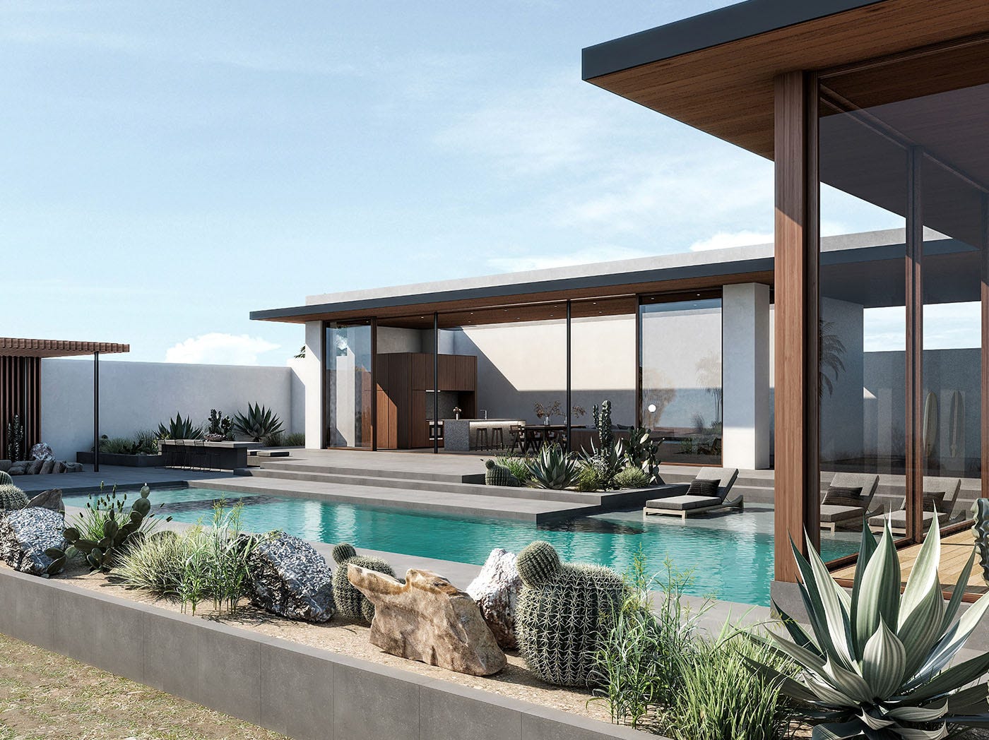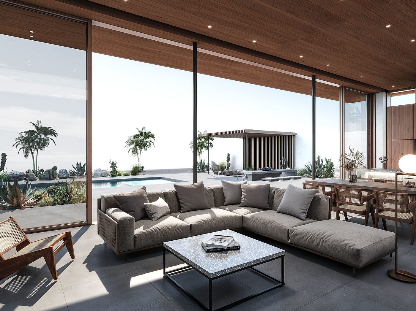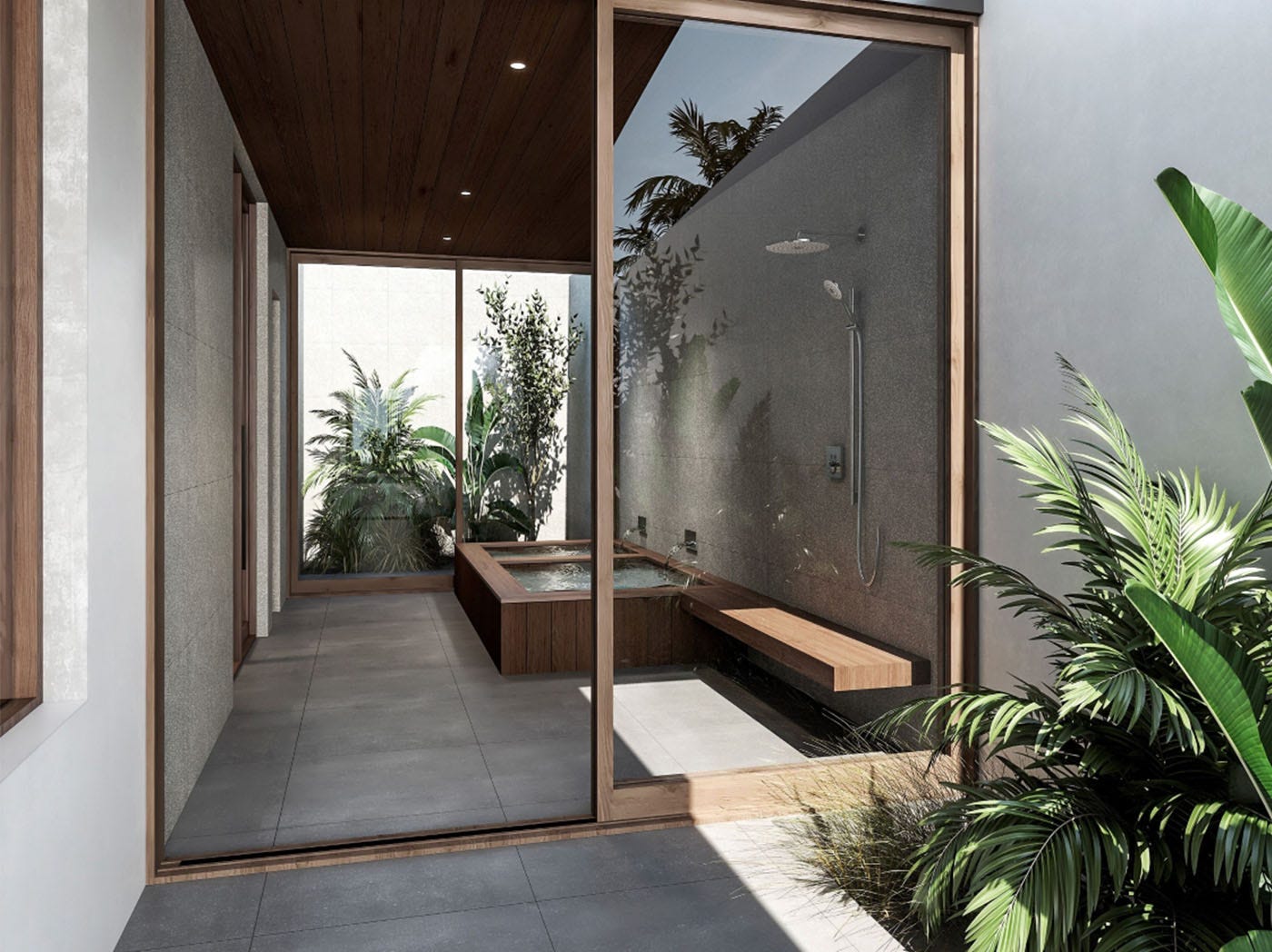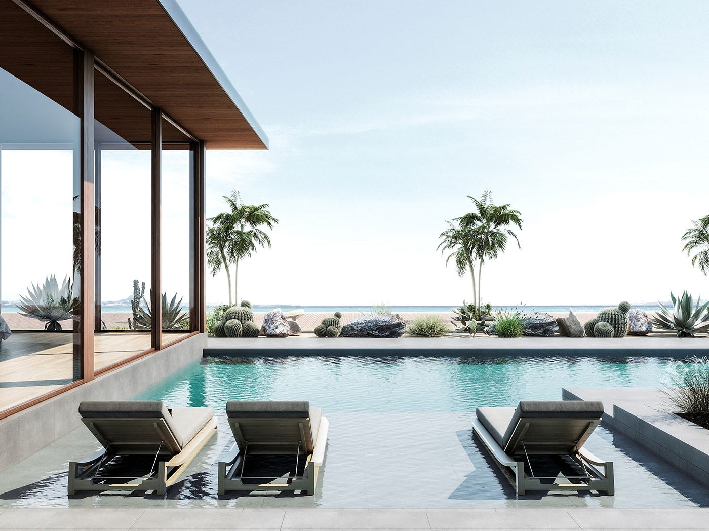 またここでは、海の景色をもっとも美しく見せるために、テラスやリビングダイニングのフロアレベルを段々と高く調整している。「この2~3段が、プールと緩やかにつながる海の水平ラインを美しく見せています」